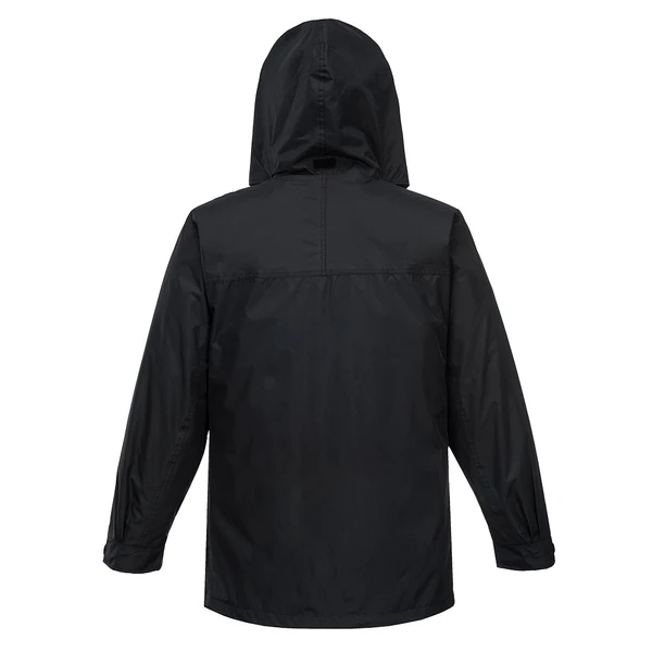 Long line jacket, storm proof collar and cuffs, concealed hood, fully lined in brushed cotton and taffeta, embroidery access.